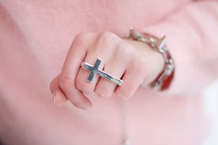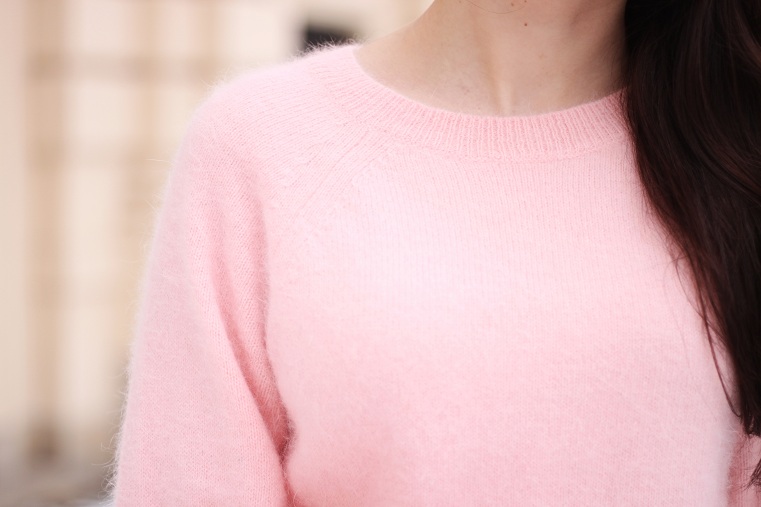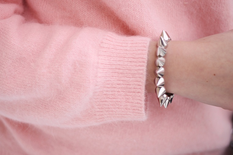 Podoba mi się zestawienie delikatnego, różowego sweterka i ciężkiej, czarnej reszty.